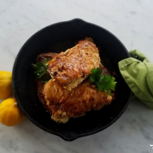 First, I dredge the chicken in cassava flour and then give it a quick dunk in beaten egg. Next, I pan fry the chicken until it’s browned. Finally, I add the other ingredients to the pan to create a lemony white wine sauce, return the chicken to the pan, and put the whole thing in the oven to finish cooking.