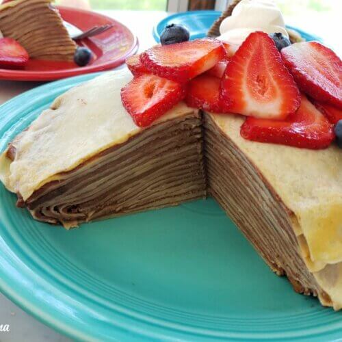 There are lots of different yummy crepe cake options out there. Some call for cocoa powder in the crepe batter for a chocolate crepes version. Others use buttercream, cream cheese, powdered sugar, or chocolate ganache on their homemade crepes.