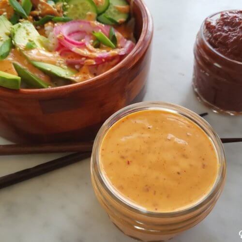 If I have gochujang already made in the fridge, I can make gochujang mayo in less than 5 minutes. I just whisk together regular mayonnaise with a couple of tablespoons of gochujang and a squeeze of lime juice.