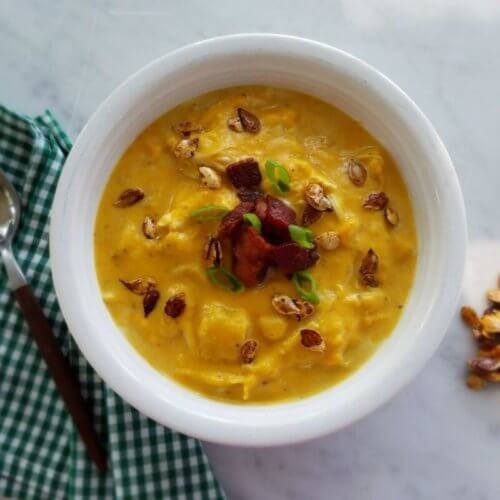 - Serve with optional toppings such as crumbled bacon, cheese, green onions, and roasted squash seeds, and a side salad.